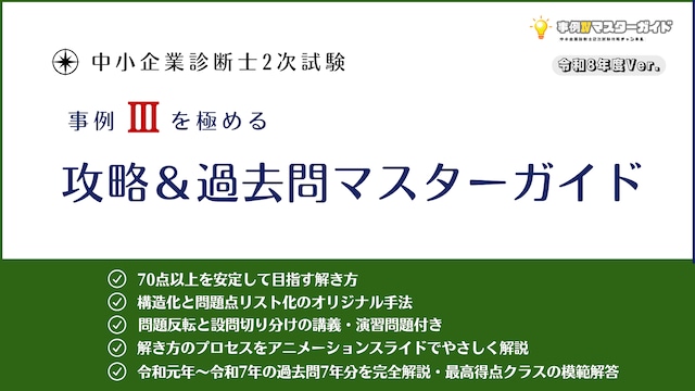 中小企業診断士2次試験・事例Ⅲ対策教材 事例Ⅲに特化した攻略方法&過去問解説集です。 ⭐Ver.2にアップグレードしました。(令和8年度版) - 令和7年度完全解説を追加 【アップグレードについて】 ・マスターガイドはアップグレードがです。 ・ダウンロード再発行の手続きも無料で行いますのでダウンロード後にレビューのご協力をお願いいたします。 ・お問い合わせフォームからご依頼ください。(チャットコメントの場合は氏名・注文番号がわかる形でお願いします) ※永年の更新保証はしておりませんのでご了承願います。 【内 容】 ✓ 70点以上を安定して目指す解き方 ✓ 構造化と問題点リスト化のオリジナル手法 ✓ 問題反転と設問切り分けの講義・演習問題付き ✓ 解き方のプロセスをアニメーションスライドでやさしく解説 ✓ 令和元年~令和7年の過去問7年分を完全解説・最高得点クラスの模範解答 中小企業診断士2次試験 事例Ⅲを極めるための電子版ガイドブックです。スライドのアニメーションでは問題の解き方やプロセスを表示しているので理解度を高めることができます! 著者は、中小企業診断士試験を合格後、独学による独自ノウハウを中小企業診断士の試験対策ブログとして発信しています。さらに市販の問題集や試験過去問を徹底的に分析して、試験問題の傾向や押さえておくべき基礎理解や論点を深く研究しています。 事例Ⅳに続き、事例Ⅲの攻略法についてその解答法や思考方法を全て公開しています。事例Ⅲの本試験対策力を身につけ、確実に高得点をゲットしましょう! 【必ずお読みください】 本商品はデジタル版であり、PowerPoint(PC)、Microsoft powerpoint(スマホ・タブレット)またはPDFで読み込むことができます。複製、配布、販売、転載、転用、交換などは著作権により禁じられています。デジタルコンテンツは購入同時にダウンロード権利が付与されるため返品や返金が出来ませんのでご注意ください。 【ダウンロードについて】 ※ダウンロードにはインターネット環境が必要です。 ※事前に動作環境をご確認ください。 ▼テストファイル(ZIP)をダウンロードしご確認願います。 https://drive.google.com/file/d/1Fb6JYn-oaGAMRSK_FCY8C85yKOlgRRfB/view?usp=sharing ※携帯電話・スマートフォンやタブレットなどは、正常にダウンロードできない場合があるため、PCからダウンロードが推奨されています。(もしダウンロードできなかった場合はお申し付けください) ※購入完了メールにダウンロードURLが記載されます。URLにアクセスし、購入時のメールアドレスをご入力いただくことでダウンロードが可能となります。オンラインストアの特性上購入から3日間までに3回までダウンロードすることが可能です。 ※携帯電話・スマートフォンやタブレットなどは、正常にダウンロードできない場合があるため、PCからダウンロードが推奨されています。 ※Verの更新版を再ダウンロードしたい方はストアにお申し付けください。(Ver情報は下記をご参考) 【使用方法】 ※.pptxファイルは読み取り専用で開いてください。 ※Googleスライドだと文字がズレたり一部非表示になりますのでPowerPointが推奨です。 ※officeのバージョンが古い場合、フォントの表示が異なる場合があります。 ※スマホではMicrosoft365アプリからスライドショーで見ると文字ズレなく見ることができます。(アプリダウンロード後の有料課金は不要です) ※PCでofficeソフトが無い場合、OneDriveクラウド内で読み込めます。 【レビューのお願い】 ▼もしよければレビューをお願い申し上げます( ;∀;) ・【ご購入案内メール】の下の方 ・【注文情報を確認する】ボタン ・メールアドレス入力→【レビューを書く】 【Ver.情報】 Ver1.00 2025/1/23 リリース Ver1.10 2025/2/18 R6年度 出題の趣旨追記 Ver.1.20 2025/9/25 フォント埋め込みVerに改訂 ■アップデート Ver.2.00(2026/2/8) 令和8年度Verに更新(R7年解説追記)