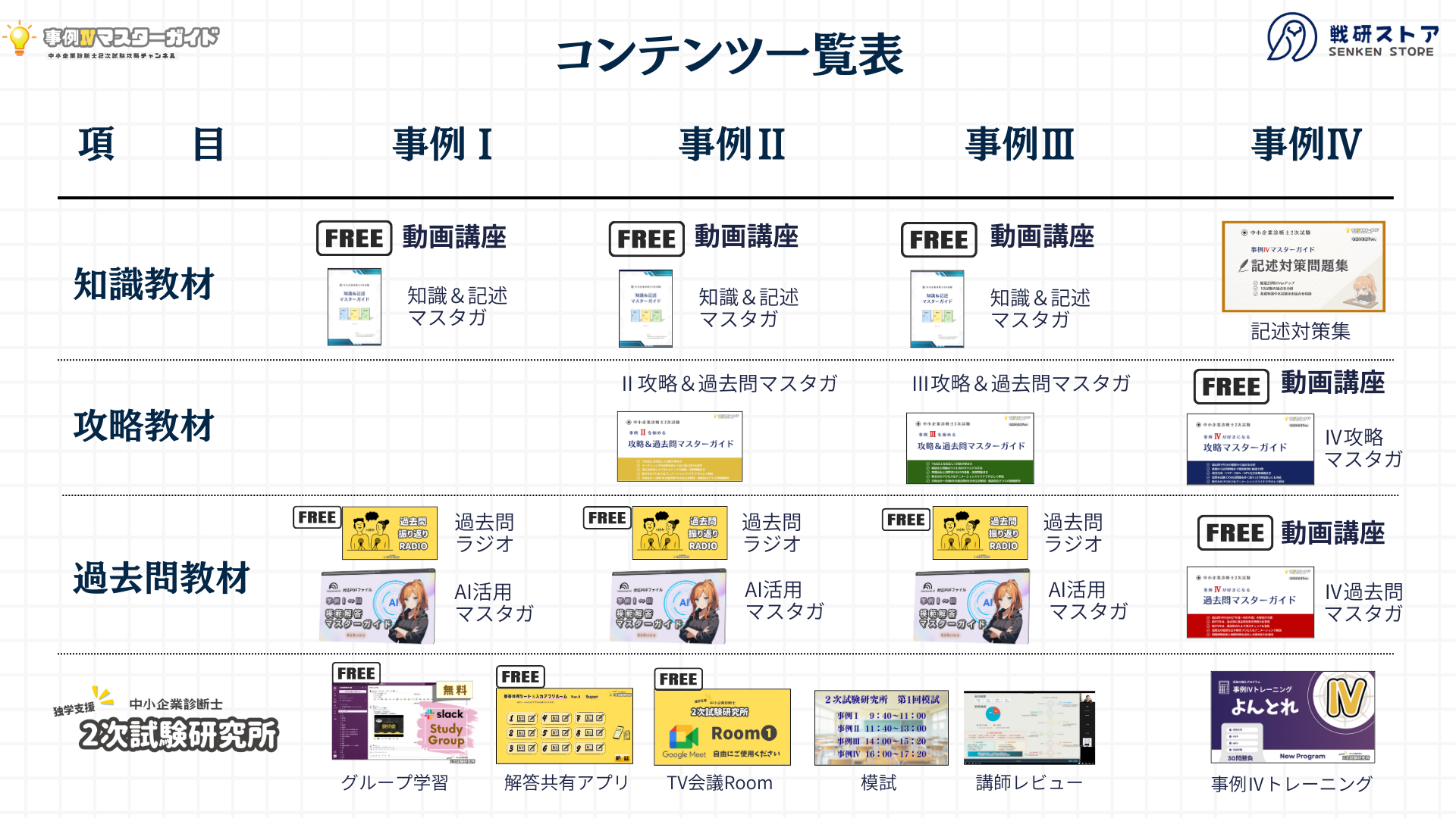 中小企業診断士2次試験・知識&記述マスターガイドと模範解答マスターガイドのセット教材です。事例Ⅰ~Ⅲの基本対策はこちらでばっちり! ※事例Ⅲをよりマスターする方は事例Ⅲマスターガイドを活用ください。 【商品説明】 ➊知識&記述マスターガイド 知識&記述マスターガイドは、受験生のための2次試験用知識の補充と50~150字の記述力を鍛えるトレーニング問題集です。試験対策だけではなくリアルな実務にも役立つ知識を身につけつつ、事例対応力を強化できます。 【内容】 ∟PPT資料 ∟PDF資料 ✓ リアルな81社のプチ事例集 ✓ 全て解説(論点整理)と模範解答例付き ✓ 本試験の未出論点も網羅 ➋模範解答マスターガイド 中小企業診断士2次試験用、事例Ⅰ~Ⅲの過去問の学習効果を高めるための補強教材です。 GoogleNotebookLMのソースナレッジとして最適なPDFとなっています。 ■GoogleNotebookLMは無料で使えるAIチャットツールです。 使用方法はこちらの動画でもご確認いただけます。 https://youtu.be/gYRVRqzZZSk?t=21m40s 【内容】 ∟PDF資料 ✓ H27~R06年 事例Ⅰ~Ⅲ 10年分の過去問解説書 ✓ 使い方 ✓ プロンプトの例(NotebookLM用) ✓ 解答のポイント(NotebookLM用) ✓ 採点基準 (NotebookLM用) ✓ STRIKE分析(NotebookLM用) ✓ 燦ちゃん設定方法 ■よくある質問 https://smri.official.ec/p/00001 【必ずお読みください】 本商品はデジタル版であり、PowerPoint(PC)、Microsoft powerpoint(スマホ・タブレット)またはPDFで読み込むことができます。複製、配布、販売、転載、転用、交換などは著作権により禁じられています。デジタルコンテンツは購入同時にダウンロード権利が付与されるため返品や返金が出来ませんのでご注意ください。 【ダウンロードについて】 ※ダウンロードにはインターネット環境が必要です。 ※事前に動作環境をご確認ください。 ▼テストファイル(ZIP)をダウンロードしご確認願います。 https://drive.google.com/file/d/1Mf3_zpUDHQv5Ezcf8OUvv_sNfTBKsTc-/view?usp=sharing ※携帯電話・スマートフォンやタブレットなどは、正常にダウンロードできない場合があるため、PCからダウンロードが推奨されています。(もしダウンロードできなかった場合はお申し付けください) ※購入完了メールにダウンロードURLが記載されます。URLにアクセスし、購入時のメールアドレスをご入力いただくことでダウンロードが可能となります。オンラインストアの特性上購入から3日間までに3回までダウンロードすることが可能です。 ※携帯電話・スマートフォンやタブレットなどは、正常にダウンロードできない場合があるため、PCからダウンロードが推奨されています。 ※Verの更新版を再ダウンロードしたい方はストアにお申し付けください。(Ver情報は下記をご参考) 【使用方法】 ※.pptxファイルは読み取り専用で開いてください。 ※Googleスライドだと文字がズレたり一部非表示になりますのでPowerPointが推奨です。 ※officeのバージョンが古い場合、フォントの表示が異なる場合があります。 ※スマホではMicrosoft365アプリからスライドショーで見ると文字ズレなく見ることができます。(アプリダウンロード後の有料課金は不要です) ※PCでofficeソフトが無い場合、OneDriveクラウド内で読み込めます。 【レビューのお願い】 ▼もしよければレビューをお願い申し上げます( ;∀;) ・【ご購入案内メール】の下の方 ・【注文情報を確認する】ボタン ・メールアドレス入力→【レビューを書く】 【Ver情報】詳細は各製品ページにて 知識&記述マスターガイド ver1.09 模範解答マスターガイド Ver1.04