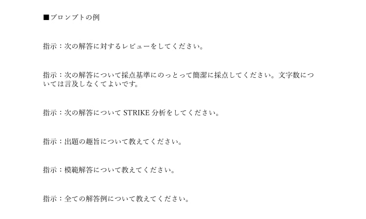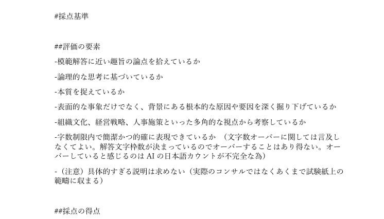 • 採点に関してはどれほど指示を明確に与えても完全に再現することは難しいです。あくまで目安として捉えてください。